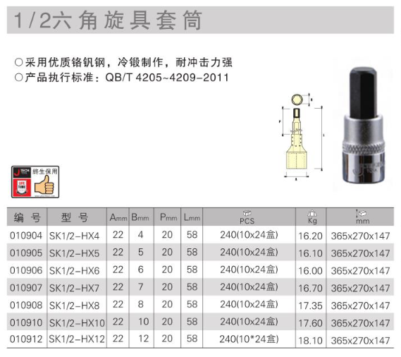 >  SK1/2-HX6 捷科 六角旋具套筒