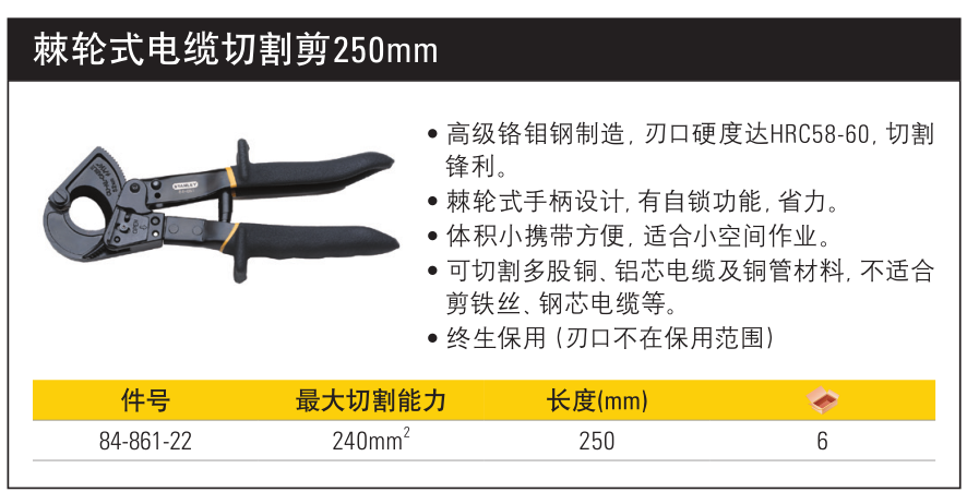 >  史丹利 棘轮式电缆切割剪0-240mm2