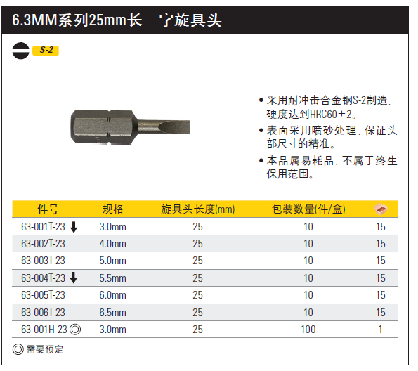 >  史丹利 6.3MM系列一字旋具头SL6.5x25mm(x10)