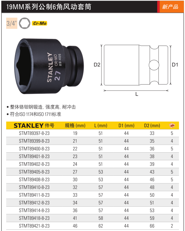 >  史丹利 19MM系列公制6角风动套筒46mm